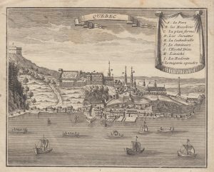 Épreuve à bonnes marges de cette gravure anonyme présentant les différents édifices du port de Québec : le Fort, les Recollets, la plate forme, les Jesuittes, etc. Pli vertical, petite mouillure angulaire.