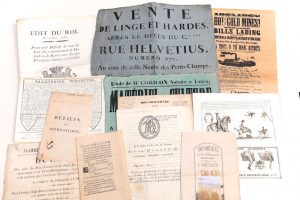 LOT de 19 PIÈCES IMPRIMÉES : •1. Edit du Roi de Sardaigne de 1788 « qui défend les jeux de hasards et de renvi. ». •2. Affiche timbré de vente de Linges et Hardes. 670 Rue Helvétius, au coin de la rue neuve des petits champs, le 2...