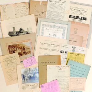 •une carte de membre pour l'année 1899, deux invitations sur carton rose pour le dimanche 28 octobre 1900 pour une soirée dansante au Rocher de Cancale et deux cartons pour des courses vélocipédiques sous le patronage de la Ville le dimanche 25 juin 1899. Enfin, pour le Cycle Amateur Versaillais : Programme d'une soirée le 27 février 1899. Grand in-8 pour cette maquette originale sur papier rose aux lettres rehaussées de vert - joli dessin de Balbus d'une cycliste sur sa machine.