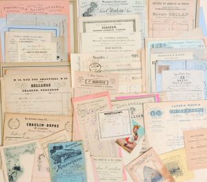 factures de vétérinaires de 1869à 1919 dont une très belle “G. de Sobry médecin vétérinaire ex-chef de travaux à l’Ecole d’Alfort” détaillant les travaux effectués sur les chevaux de janvier à septembre 1898 — 6 factures Bourrellerie Sellerie de 1898 à 1918 — 4 factures maréchal-ferrant - Maréchal Expert de 1886 à 1898— 2 factures de charron forgeron1872 rue de Limoges et1890 rue des Chantiers — Bignon bourrelier sellier 55 rue de l’Orangerie 1873— une facture de Billette-Mazure Son et commerce de grains 42 avenue de St Cloud en 1859 — CHAULIN-Dupré marchand grainetier , recoupe, recoupette et farines... Avoine, son, fourrages brosserie et articles d’écurie 15 rue du Peintre Lebrun 1892.