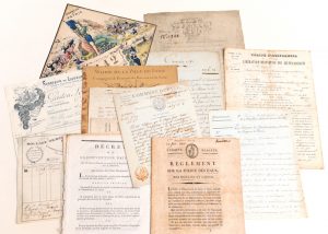 •255. « Lettre de Maîtrise des Ouvriers en soie » pour Henry Regné, Compagnon de Lyon (69), fait au bureau à Lyon le 27 Octobre 1773. Page gravée remplie à l’encre (27 x 23cm). Pièce signés des Maitres et Gardes de la Communauté des Marchands et Maîtres Ouvriers en Drap d’or, d’argent et Soye de la ville de Lyon.