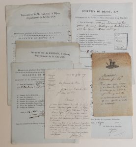 Vivant CARION (1769- 1834) : « Ensemble de déclarations et de bulletins de dépôts » Dijon, 1815-1833. 21 feuillets de format in-8 ou in-4, pré-imprimés et manuscrits. L’auteur est le père de la presse locale dijonnaise. ▬On y joint...