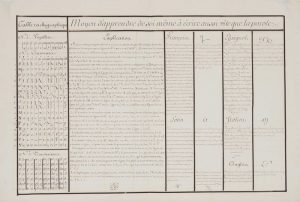 Jean COULON de THEVENOT (1754-1813) : « Table tachygraphique, Moyen d’apprendre de soi-même aussi vite que la parole ». Très belle feuille manuscrite au format in folio fin 18ième (1780/1790) sur papier vélin. Procédé inventé par...