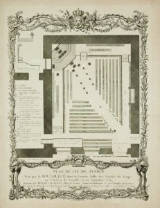 PLAN DU LIT DE JUSTICE 20 septembre 1759 tenu par le Roi Louis XV dans la grande salle des gardes du corps, ordonné par Mgr le Duc de Duras et conduit par Monsieur Papillon de la Ferté intendant contrôleur général de l'argenterie, menus...