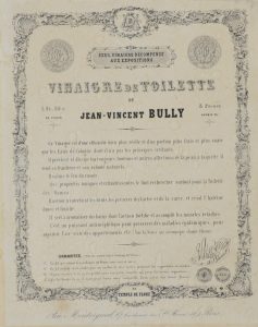 AFFICHETTE : Vinaigre de toilette de Jean Vincent Bully, 35,3 x 28,7 cm. Expositions de 1823 à 1855. ▬On y joint •un bel ensemble de 32 estampes diverses réunies dans une reliure de format oblong vert dont les métamorphoses du jour par...