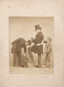 « LE VOLEUR DE FOULARD » Photographie sur papier albuminé fin XIX° présentant un homme de qualité se faisant cirer ses chaussures pendant qu’un gamin de Paris lui vole discrètement une belle écharpe blanche de soirée. 24 x19 cm....