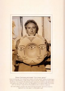 PHOTO : « Jean Cocteau présente les 3 yeux ». Tirage argentique d’après Lucien Clergue ( ?) (1934-2014) signé au tampon au dos « Agip/Robert Cohen ». 18 x 13 cm.