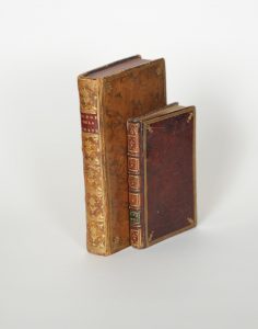 en veau marbré ornée sur le plat d’un triple filet doré et fleurs dorées aux coins ainsi que sur le dos avec son titre en doré sur fond rouge.