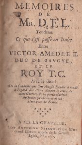 « MÉMOIRES de Mr D.F.L touchant ce qui s’est passé en Italie entre Victor Amédée II Duc de Savoie et le Roy » Aix La Chapelle chez Antoine Steenhuysen, 1697. Il s’agit d’évènements survenus sous le règne de Louis XIV concernant les...