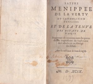 Pierre LEROY (Chanoine de Rouen et aumônier du Cardinal de Bourbon): « Satyre Menippé de la vertu du Catholicon d’Espagne et de la tenue des estats de Paris. Augmenté de nouveau outre les précédentes impressions du Supplément du Catholicon...
