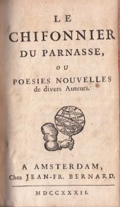 Alexis PIRON (1689 – 1773) : « Le Chiffonnier du Parnasse, ou poésies nouvelles de divers Auteurs. Amsterdam : Jean-François Bernard, 1732. ▬Suivi de : •Jean RACINE (1639-1699) : « Le Banquet de Platon ». Paris : Pierre Gandouin, 1732...