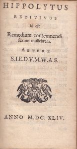 S. I. E. D. V. M. W. A. S : « HIPPOLYTUS REDIVIVUS, id est Remedium contemnendi sexum muliebrem ». 1644. Petit ouvrage au format in-18 dans une reliure XVIII° en maroquin rouge avec ses tranches dorées, le plat orné d’un triple filet doré...