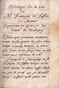 MANUSCRIT FIN XVIII/Début XIX°: « Abrégé de la vie de M. François de Fisson du Montet Capitaine et prévôt du comté de Chaligny », Petit manuscrit in-16 de 70 pages dans sa reliure d’époque en veau brun avec son dos à nerfs orné et ses...