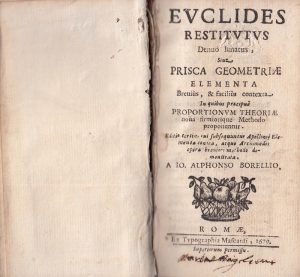 Giovanni Alfonse BORELLI (1608-1679) : “Euclides restitutus denuo limatus, siue prisca geometriae elementa breviùs, & faciliùs contexta ... Editio tertia, cui subsequuntur Apollonii elementa conica, atque Archimedis opera breviori methodo...