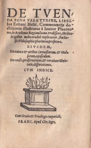 Eobanus HESSUS (1488-1540) : « De tuenda bona valetudine libellus Eobani Hessi, commentariis doctissimis illustratus a Joanne Placotomo » Frankfurt : Christopher Egenolphus (Imprimeur) sans date (1551) ►Ouvrage rare in-16 en latin de 114...