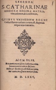 « LEGENDA S. CATHARINAE MEDICAE, REGINAE MATRIS, vitae, actorum et consiliorum quibus universum regni Gallici statum turbare conata est, stupenda eaque vera enarratio » Non situé. 1575. Il s’agit du plus célèbre pamphlet publié sans nom...