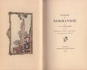 Jean François REGNARD (1655 – 1709) : « Voyage en Normandie » Evreux, Imp. Charles Herissey, 1883. Illustrations en couleur par Charles Denet (1853-1939). Édition in-18 dans une reliure signée Rousselle en maroquin noir estampée de...