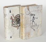 Deux volumes in-12 sous couverture en parchemin illustrée d’un dessin original à la plume (reliure moderne), dos avec titre et date en lettres manuscrites.