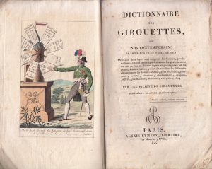 « Ouvrage dans lequel sont rapportés les discours, proclamations, extraits d’ouvrages écrits sous les gouvernements qui ont eu lieu en France depuis vingt-cinq ans ; et les places, faveurs et titres qu’ont obtenus dans les différentes circonstances les homme d’État, gens de lettres, généraux, artistes, sénateurs, chansonniers, évêques, préfets, journalistes, ministres, et.. par une société de girouettes” (titre)