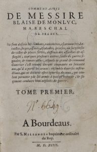 *** [Livres du XVIe s.]. MONTLUC (Blaise de). Commentaires de messire Blaise de Montluc… où sont descris les combats, rancontres, escarmouches, batailles, sièges… A Bourdeaus, par S. Millanges, 1593 et 1592, deux tomes en un fort volume in-8,...