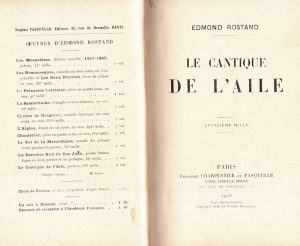 Edmond ROSTAND (1868-1918) : « Le cantique de l’aile » Paris, Charpentier et Fasquelle, 1926. Édition in-8 dans une reliure en demi-chagrin havane comportant son titre et nom d’auteur en rouge et son dos orné d’une fleur au centre avec...