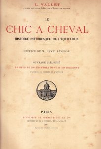 L. VALLET (1856-1940) : « Le chic à cheval, histoire pittoresque de l’équitation » Paris, Firmin Didot 1891. Édition in-folio. Reliure en demi basane et coins marrons, premier plat illustré d’un fer à cheval avec titre en lettres...