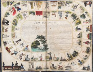 Jeu de l'oie à 41 cases avec un parcours en spirale rectangulaire sur le thème des misères de la vie, la première étant la venue au monde et la dernière le mariage.