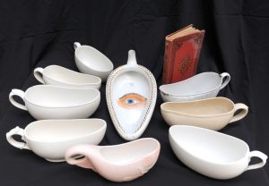 ÉROTIQUE : Ensemble de 8 récipients dit “Bourdaloue” en porcelaine d’époque 19Ième dont un en forme de poisson et un à caractère visuel. ▬On y joint •un autre modèle en tôle et un ouvrage d’A. Laurent : « Bourdaloue,...
