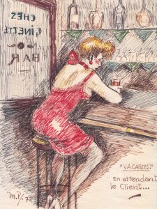 M.P (XX°): «En attendant le client » Dessin au feutre, signé en bas à gauche et daté 1972. 29 x 22 cm.