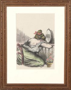 ANONYME : « Rêverie sur le balcon de l’hôtel ». Gravure rehaussée.
