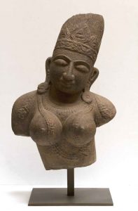 INDE XIXe : Buste de déesse, la tête supportant Bouddha assis en méditation. Grès. 50 x 35 cm.