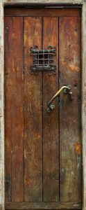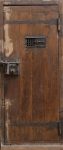 rivet, un heurtoir et une poignée à l’ extérieur, un judas coulissant en fer forgé à l’intérieur avec son système de verrouillage ainsi qu’ un verrou à clé avec en fer forgé à l’intérieur.