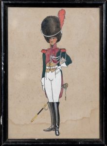 ÉCOLE FRANÇAISE XIX° : ‘Hussard’. Gouache et aquarelle sur papier. Manuscrit de Paul Adam (1862-1920) « La Force » contrecollé au dos. 26 x 18 cm (A vue)