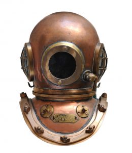 CASQUE DE SCAPHANDRIER SIÈBE & GORMAN and Co LTD, plaque rivetée (Angleterre), modèle 12 boulons – trois hublots dont deux à grille, étamé, marine Anglaise.