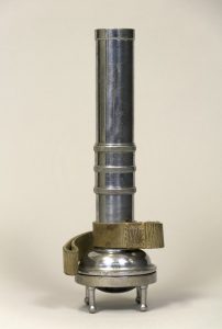 LAMPE DE SCAPHANDRIER ANGLAISE EN LAITON de marque Siebe Gorman dite "Siebe Gorman Admiralty Pattern Diving Lamp". Modèle 1936, 4 picots de protection du verre bombé. Modèle avec fond se dévissant. L. 28 cm.