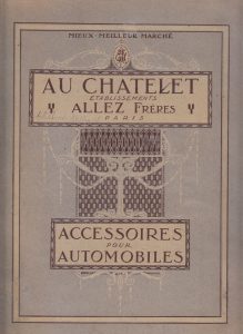 AUTOMOBILES AU CHÂTELET : « Accessoires pour AUTOMOBILES ». Paris, 1911. Beau catalogue broché au format in-4 sous couverture illustrée, imprimé par Tolmer en vert avec encadrement en jaune, contenant outre la reproduction des...