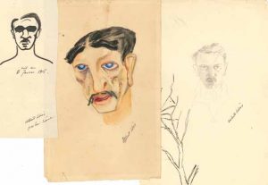 Ensemble de dessins à la mine de plomb, aux crayons de couleur, à la plume ou à l’aquarelle. Trois autoportraits ; nus, portraits (son oncle Félix, sa femme Inès, ses condisciples à l’école de droit..), caricatures, paysages, animaux, (son chien Sultan), personnages de fantaisie, etc. Portrait de Bergson (mine de plomb, 20 x 14 cm, reproduit dans Adès chez Bergson, 1929). On joint un portrait dessiné d’Albert Adès par G.H. Sabbagh, crayon et fusain, dédicacé à Mme Hélène Adès (27 x 21 cm).