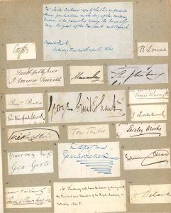 Gravures, illustrations découpées de revues, dessins, photographies (dont un portrait de Millais), et autographes, le tout collé dans l’album. Environ 30 lettres (la plupart L.A.S.) de Robert Baden Powell, Frank Brangwyn, George Cruikshank (gravure dédicacée The British Bee Hive, et grand signature), Charles Dickens (2), George Harcourt, Rudyard Kipling (l.s.), George W. Lambert, Philip de Laszlo, William Nicholson, Herbert Oakeley, Julius Olsson, Glyn Philpot, John Singer Sargent, Claude Shepperson, William M. Thackeray, etc. Nombreuses signatures découpées d’artistes, écrivains, savants, politiques : L. Alma Tadema, Robert Browning, Wilkie Collins, John Constable, Cruikshank, Dickens, Michael Faraday, Copley Fielding, John Forster, Gladstone, George Grote, Sydney Hall, John Herschel, W. Holman Hunt, Landseer, William Linton, Edwin Long, Macaulay, Millais, Richard Owen, Palmerston, Edward Poynter, Joshua Reynolds, David Roberts, Thomas Stothard, Alfred Tennyson, James Tissot, Thomas Webster, etc.