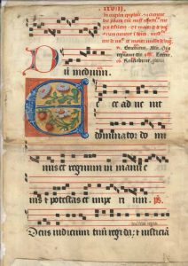 Pages détachées d’antiphonaires des XIVe et XVe siècles pour réemploi (reliures, chemises de classement, etc.) : musiques liturgiques en notations carrées, avec initiales ornées, dont un beau E peint avec fleurs et fraises (Ecce advenit dominator…). On joint un bifolium de missel (petit in-4) avec de belles initiales enluminées, un bifolium de graduel avec musique notée (in-8), et un bifolium extrait d’un manuscrit de droit canon, sur deux colonnes entourées de gloses, avec initiales ornées et enluminées (in-fol.).