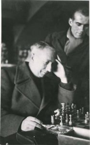 Portrait d’Arp devant un échiquier, cigarette à la main, le jeune René Char debout au second plan.