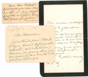 Maurice Denis (à E. Berteaux, rendez-vous devant les fresques de Botticelli de la villa Lemmi pour une causerie) ; Gustave Moreau (29 décembre 1885, à M. Montaignac, transmettant une note) ; Georges Rochegrosse (reçu de 100 F de M. Méaulle, 6 juin 1884, « pour le dessin frontispice de la Petite Sœur ») ; Auguste Rodin (sur sa carte de visite, à Jean Dolent, lui adressant des excuses, il était en voyage).