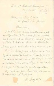 BERGSON (Henri) (1859-1941). L.A.S., Paris 12 juin 1931, à Louis J. Fatio, à Genève ; 1 page in-8.