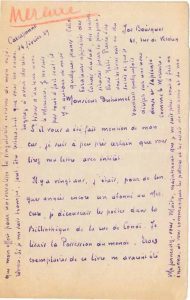 Intéressant ensemble. 2 février 1939. Envoi au Mercure du manuscrit « remanié, ramassé, raccourci, purgé de quelques “ornements” », d’un ouvrage qui doit paraître aux éditions Denoël : « Denoël m’a laissé toute latitude pour la publication en revue »… 24 février 1939. Présentation à Duhamel de l’ancien lecteur passionné de La Possession du Monde : « Laissez-moi vous confier que j’ai versé des larmes en lisant l’épisode de la cigarette. Je venais de recevoir une balle dans la colonne vertébrale. Immobilisé depuis des mois, je commençais à comprendre que c’était pour toujours. C’est le même lit, la même chambre, et le même homme, au fond »... Depuis, il a publié des livres, dont La Tisane de sarments, et le troisième, à paraître chez Denoël, a fait l’objet de soins particuliers, et d’une refonte, et a été soumis au Mercure : « vous comprenez pourquoi. J’ai quarante-deux ans maintenant. Contre toute attente, ma pyélo-néphrite m’a fait grâce. Les crises de fièvre se font plus rares : les troubles trophiques ont disparu. Évidemment, je ne marche pas, je ne marcherai jamais. Cependant puisque les ruines sont décidément ensevelies et qu’il y a peut-être à durer encore, je voudrais enlever à la dernière partie de mon œuvre ce caractère de témoignage hâtif et fiévreux que l’on voit à La Tisane de sarments. Je voudrais me ressaisir, accepter avec ma volonté le sort qui me fait écrivain : c’est le moment de reconnaître les influences que j’ai subies, de trouver mon climat et ma ligne d’horizon »… 3 mai 1939. « Je vous avais, il y a un mois, adressé le manuscrit d’un texte en prose : Iris et Petite-fumée. Une lettre personnelle, que j’adressais en même temps à Monsieur Duhamel est restée sans réponse. Devant votre silence, j’ai cru devoir répondre affirmativement à l’offre d’un éditeur. […] Votre attitude semble signifier que j’ai grossièrement contrevenu aux usages du Mercure »…