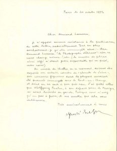 22 mai 1955. « Le Photographe délirant, voilà qui est bien joliment trouvé. Rien ne nous change mieux de la pseudo-poésie à la mode de 1955, qui rendrait des points à la peinture sous le rapport de la non-figuration ! Qui en excepteriez-vous pour cette dernière période ? Moi : Féminaire, de Robert Droguet, Déchirures, de Joyce Mansour et La Vie aux frontières du poème, de Jean-José Marchand. C’est tout ce que j’ai vu passer sur l’esplanade avant le Photographe »… Il est touché que Lanoux lui en offre la dédicace de cette suite de poèmes « d’une perspective mystérieuse, très délicate », qui lui « rappelle un peu les Rhénanes d’automne »… 24 octobre 1956. Il « n’oppose aucune résistance » à la publication de la lettre précédente, mais en indique une coupure à y pratiquer, puis signale une exposition intéressante au musée de Chelles, « de “plombs de Seine”, très curieuses figurines dont la plupart auraient été trouvés immergées sous le Pont-au-Change et dont on ne sait à peu près rien. J’ai prêté celles que Wolfgang Paalen, à son départ pour le Mexique, m’avait laissées en garde »…