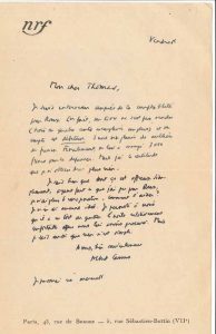 CAMUS (Albert). (1913-1960). L.A.S., Vendredi [31 octobre 1947], à Henri Thomas ; 1 page in-8 à en-tête nrf, enveloppe.