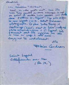 Lundi 18 [octobre 1948]. Remerciements pour son article [« Blaise Cendrars et Henry Miller », Revue de Paris, octobre 1948] : « Cela va sûrement me valoir une lettre espatouffante de Henry Miller et que je vous enverrai en hommage, quand je la recevrai. Je n’ai pas oublié ma promesse, mais j’ai du retard dans mon travail. Vous recevrez un paquet de 100 pages avant la fin de l’année – et vous en ferez ce que vous voudrez ». Il donne l’adresse de Henry Miller en Californie… Vendredi 29 [octobre 1948]. « Vous êtes bien trop gentil de vous occuper de moi au point de vouloir faire passer une photo dans l’album du Figaro. […] M. Robert Doisneau, photographe, 46 place Jules Ferry, à Montrouge (Seine) vient de faire quelques photos extraordinaires à St Segond »… Samedi 4 [février 1950]. « Bien reçu le n° de février de la Revue de Paris et vous remercie très sincèrement de votre grand papier sur Le Lotissement du ciel. À ce jour, c’est ce que l’on a écrit de mieux sur ce bouquin »… Jeudi 9 [novembre 1950]. Il est touché mais embarrassé par une demande de titre à annoncer immédiatement. « Je vous destine un fragment d’une centaine de pages, où il s’agit d’une vieille comédienne, mettons l’éloge funèbre d’une vieille comédienne – mais je me demande si votre Revue pourra jamais publier ce fragment, tellement le début en est scabreux »… 1er juin [1953]. « Comment m’excuser ? Je suis toujours dans le même état d’incertitude et je n’ai toujours rien à vous adresser, pris que je suis par le roman que j’ai sur le chantier et dont je ne veux me laisser distraire par rien »…