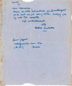 « Merci de votre bel article sur Bourlinguer et de tout ce que vous y dites. Croyez que j’y suis très sensible »…