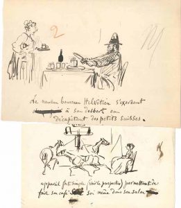 CHAM (NOÉ Amédée de, dit). (1819-1879) caricaturiste. 2 dessins originaux à la plume avec légende autographe, 12,5 x 18 et 8,5 x 15 cm.