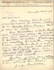 Importante et intéressante correspondance littéraire et politique, depuis la Première Guerre mondiale jusqu’après l’Occupation, à son ami et associé dans la librairie Stock. Nous ne pouvons en donner ainsi qu’un rapide aperçu. Paris 9 juillet 1914. Envoi d’un questionnaire sur l’écrivain et l’évolution de la langue, également soumis à Loti, Prévost et Curel, pour un Almanach des lettres… 28 janvier 1915. Envoi d’un fragment de Tranchées de Fauconnier : « Comme ce sont des impressions toutes personnelles, je pense qu’on ne trouvera pas d’inconvénient à ce récit de soldat. […] Fauconnier a souffert toutes sortes de maux, mais est encore en vie, et toujours dans ses tranchées »… Chardonne-sur-Vevey (Vaud) 3 septembre 1916. « Je pense rester à Chardonne jusqu’au mois de janvier »… 10 décembre. Critique de Karl Marx, citation d’un personnage de François de Curel, à propos des bienfaits du capitalisme, et jugement sur « la rêverie contradictoire » et « les songes » de Romain Rolland… 15 décembre. Réflexions sur les moralistes. « Schopenhauer m’a renversé par sa puérilité. Je crois que ce sont les “classifications” qui perdent les penseurs. […] “Le bien” n’existe pas. Les satisfactions que nous croyons éprouver après une action vertueuse tiennent à d’autres causes qu’on pourrait discerner (par exemple, à haute dose, un amour-propre de première qualité). Un psychologue, sans faiblesses, reconnaîtrait sous tous ses actes de vertus un motif qui ne dépend pas d’un bien en soi. “Le bien” est une manière d’être et de vivre qui plaît aux âmes délicates. L’homme de bien est un raffiné. Les obligations morales ressemblent aux entraves et aux règles que l’artiste s’impose pour la joie de son art »… 24 décembre. Sur les négociations entamées avec la « société littéraire », concernant la librairie. « Je me tiens ferme sur notre prix : 30 000 fr. pour le fonds d’édition. L’affaire sera magnifique pour nous ou ne sera pas »… 5 janvier 1917, au sujet de Romain Rolland : « Le mal que Romain combat n’est pas grave : il loge dans de petites têtes et n’a pas de lendemain. Celui qu’il cause est profond. Le salon de G. Trarieux et Estaunié, où se ramifie tout ce qui est un peu piqué dans les hautes têtes d’un continent, mijote avec les plus beaux sentiments et sur les fumées d’un idéalisme inconséquent, une vilaine cuisine. Romain est l’idole de ce cénacle. Et une idole agissante. Je crois qu’il y a là un danger que Marat n’eût pas toléré »… 4 avril 1918. « Petite dissertation sur le Progrès » : progrès de la science, progrès intellectuel, progrès social, progrès moral (celui-là « importe », mais « c’est le plus douteux »). En conclusion : le progrès n’est pas niable, mais il « tend à une sorte d’anéantissement de l’homme », et « le progrès scientifique et social et matériel, est beaucoup plus rapide que le progrès moral, à peine sensible s’il existe. On peut craindre des conflits douloureux »… 5 avril. Démarches pour faire rapatrier Delamain... « Mais je crois que c’est vers la conférence qui se tient à Berne depuis huit jours qu’il faut tourner les yeux. L’objet de la conférence est le rapatriement en grand des prisonniers de 1914 »… 15 avril. Éreintage du Buisson ardent, 3e partie de Jean-Christophe de Romain Rolland. « Ma principale objection contre J. Christophe, c’est que l’œuvre est truquée »… On y voit le personnage éponyme en état de crise, puis subitement, ayant regagné le goût de la vie. « La “poésie” lui souffle un tourbillon d’idées sans liens, sans conséquences, sans le moindre sens, il en est enivré. Il y a, un instant, il était prostré dans le dégout. Maintenant, il a recommencé ses gambades, il entend comme “le chant de vie qui revenait en lui” »… Pareille « frénésie de paroles incolores » peut arriver à 13 ans, non à un homme mûr. « Toute cette fin de volume, si importante, est traitée dans le plus bas romantisme. C’est du chiqué. Et du mauvais chiqué »… 15 avril. Commentaire du « livre magnifique » de B. [Le Feu de Barbusse] : « Ses défauts l’ont servi. J’entends cette perpétuelle outrance de style et cette vue grossissante. L’objet était si extraordinaire et si noir qu’il permettait un empâtement de couleur. Le tragique lui-même est nuancé »… 24 avril. Sur les chances d’une prochaine libération de Delamain : « la commission de Constance ne peut guère s’opposer dans le cas de “psychoses” », l’indulgence est recommandée et l’avis médical se fera essentiellement sur dossier. « D’ailleurs, on a naturellement, dans cette cérémonie émouvante, l’air abattu et hagard qui convient »… 26 avril. C’est chez les spiritualistes qu’on trouve la réalité des choses, démontrée par Kant, Schopenhauer, Nietzche, Bergson. « La critique de la raison, l’impuissance de l’entendement à pénétrer les choses en soi, la fiction de ce que nous appelons le monde, ont fait l’objet de démonstrations trop éclatantes, pour qu’on puisse jamais y revenir. Est-ce qu’il y a une réalité derrière ces apparences ? Sans doute. Mais elle est pour nous comme n’existant pas puisque nous ne pouvons en avoir l’idée »… Il développe sa pensée, avec allusion à la théorie de l’évolution, au surhomme de Nietzche, à la religion chrétienne, puis commente L’Essence du christianisme de Harnack, et des remarques de Renan sur le langage, fruit spontané du génie de chaque race… 2 mai. Longue réponse à une lettre sur la science et la philosophie, insistant sur la certitude de bouleversements futurs de théories qui reposent sur des interprétations de l’expérience, telles que la théorie évolutionniste. « Ce n’est pas là une objection contre la science, bien au contraire. C’est une
