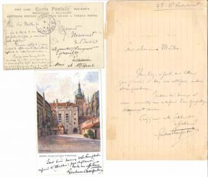 Il serait heureux qu’il accueille son entreprise « d’un sympathique et acquiesçant sourire » ; il lui demande d’être son « parrain » au sujet de sa consécration à la Chancellerie ; de Vienne (1903), il lui adresse ses félicitations : « Suis bien heureux de la triomphale reprise de Werther : pur chef d’œuvre ! »… On joint un dossier comprenant un calque de musique pour Tristesse des fêtes, une l.s. de Charpentier sur une visite du ministre Chaumié au Conservatoire populaire de Mimi Pinson (8 novembre 1902), la plaquette de Maurice Le Blond, illustrée par Steinlen, sur l’Histoire de Mimi-Pinson » (1906), et une l. d’envoi d’Edmond Rocher à Henri Saffrey. Plus une carte de vœux (carte postale de l’affiche de Louise, janvier 1939) à M. et Mme Émile Drain (enveloppe).